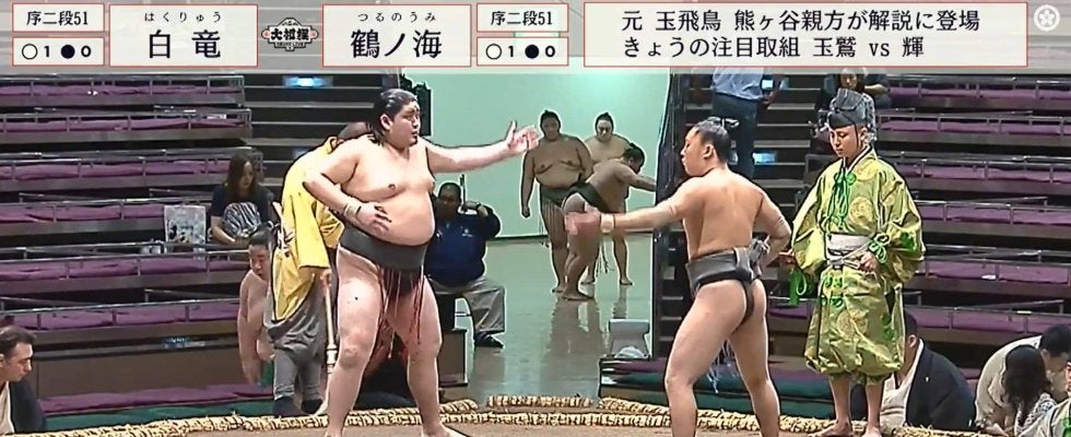 その後の取組では、立ち合いもろ手で強烈に当たった鶴ノ海が厳しい攻めを展開。だが白竜は落ち着いて対応し、最後は土俵際で白竜がはたき込みを決めて勝利した。勝った白竜は2勝目。敗れた鶴ノ海は1敗目を喫した。(ABEMA/大相撲チャンネル)