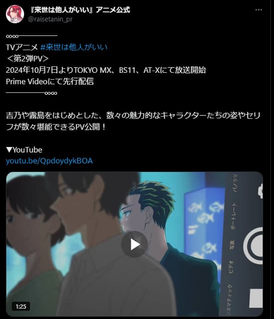 アニメ『来世は他人がいい』の公式Xアカウントは9月9日、第2弾PVを公開した。【画像】高野麻里佳が『ウマ娘 シンデレラグ…