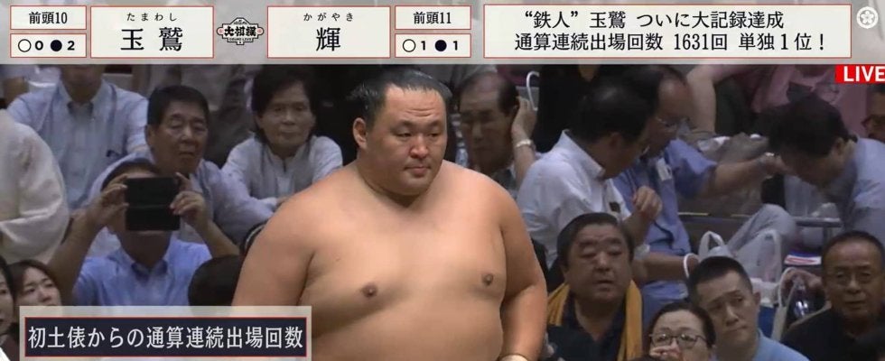 幕内最年長の39歳、前頭十枚目・玉鷲(片男波)が“鉄人”の異名に相応しい大記録を達成。初土俵からの通算連続出場1631回という歴代単独1位の偉業を成し遂げた。この偉業直後、館内に足を運んでいた有名タレントが人目もはばからず“バンザイ!”と大歓喜。その姿を見つけたファンからは「嬉しそうw」「感慨深い」とコメントが寄せられた。