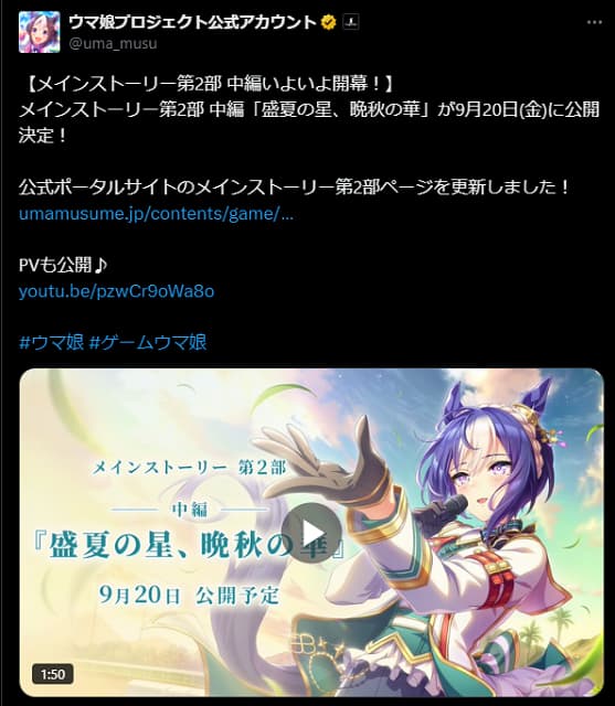 ウマ娘プロジェクトの公式Xアカウントは9月9日、メインストーリーの更新に関する情報を発表した。【画像】高野麻里佳が『ウマ…