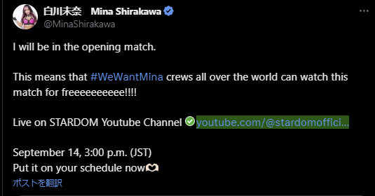 STARDOM 白川未奈、9月14日のオープニングマッチをYouTubeで無料配信! | 話題の投稿