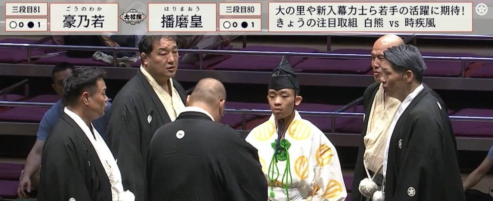 同体ではないかと物言いがついたものの、協議の結果、播磨皇の手が先についており、軍配通り豪乃若の勝ちとなった。豪乃若ははたき込みで勝って1勝目。敗れた播磨皇は2敗目を喫した。際どい決着だったものの、しっかりと勝負の行方を見極めたことを受け、ファンからは「行司最後までよく見てる」「飛んでる力士」といった声も寄せられた。(ABEMA/大相撲チャンネル)
