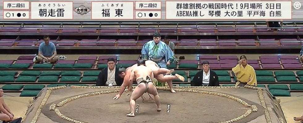 体重差を制した合気道を彷彿させる決着に客席からはどよめきの声も上がった。福東は1敗目。朝走雷は2勝目を挙げた。(ABEMA/大相撲チャンネル)
