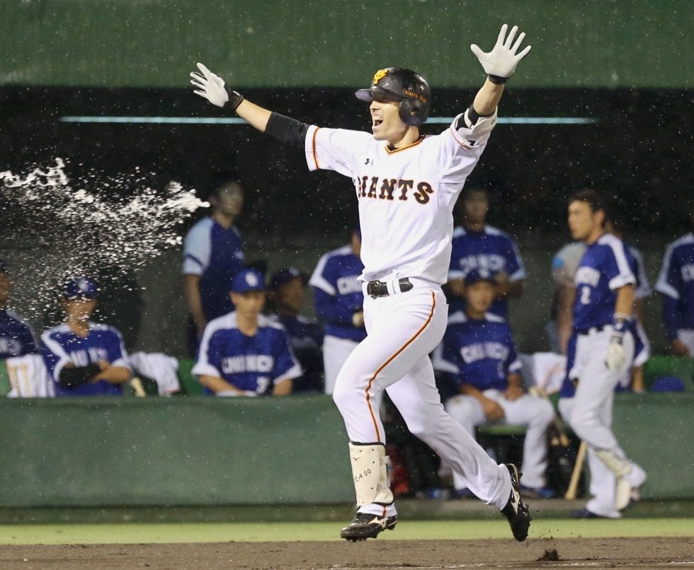 11回、サヨナラ3ランを放ち、両手を広げホームに向かう巨人・寺内=松本【写真提供:共同通信社】 読売巨人が延長戦の末に1…