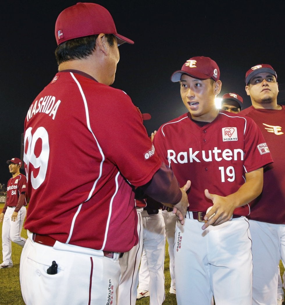 7回無失点で2勝目を挙げ梨田監督(左)と握手を交わす楽天・藤平=富山【写真提供:共同通信社】