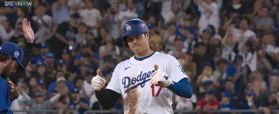 ドジャースの大谷翔平投手がカブス戦に「1番・DH」でスタメン出場。第2打席で四球を選んで出塁、警戒される中でスタートを切り、ギリギリのところで今季48個目の盗塁をもぎとった。タッチアウトを狙った相手ショートもセーフの判定に“マジかよ”とでもいうようにうなだれた。