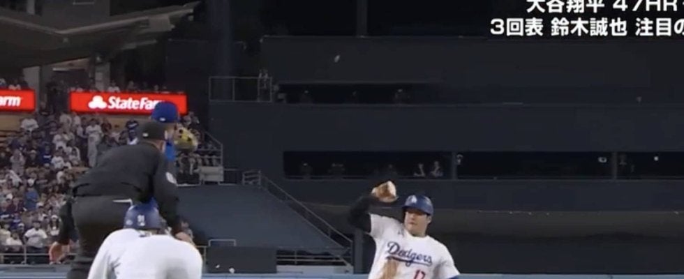 5-2、ドジャース3点のリードで迎えた2回裏・ドジャースの攻撃、1死二塁、二塁塁上には四球で歩いた後に盗塁で進んだ大谷、打席には3番のフレディ・フリーマンという場面で、フリーマンの放った打球は、センター左への飛球に。これをセンターを守るピート・クロウ=アームストロングは追いつき、キャッチしたものの、それを確認した大谷タッチアップで三塁へ。すると、大谷のスタートを予期していたかのように、アームストロングも捕球後に素早く三塁へと返球。しかしそれでも一歩間に合わず、大谷は三塁へと到達することとなった。