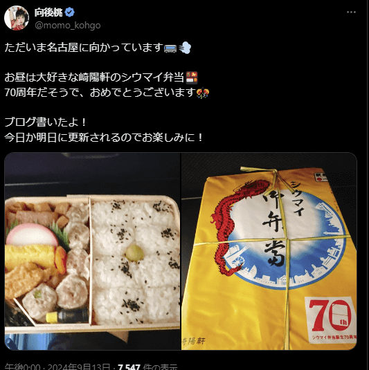 向後桃が名古屋へ向かうバスの中で、崎陽軒のシウマイ弁当を楽しんだことをSNSで報告。【画像】STARDOM 中野たむ、ト…