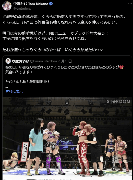 STARDOM 中野たむ、くららとの絆を語る!試合前の激励に感謝 | 話題の投稿