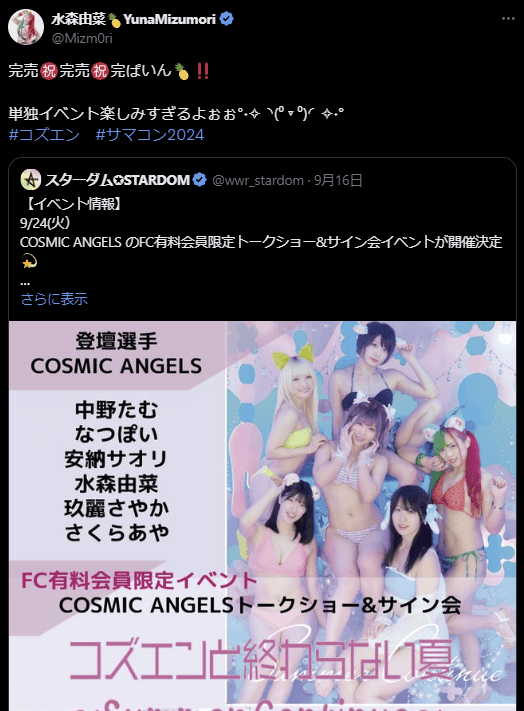 STARDOM 水森由菜、単独イベントのチケット完売を祝福!「完ぱいん🍍‼️」 | 話題の投稿