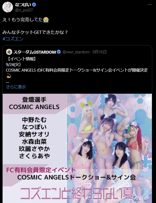 STARDOM なつぽい、イベントチケット完売に驚き「もう完売してた😭」 | 話題の投稿