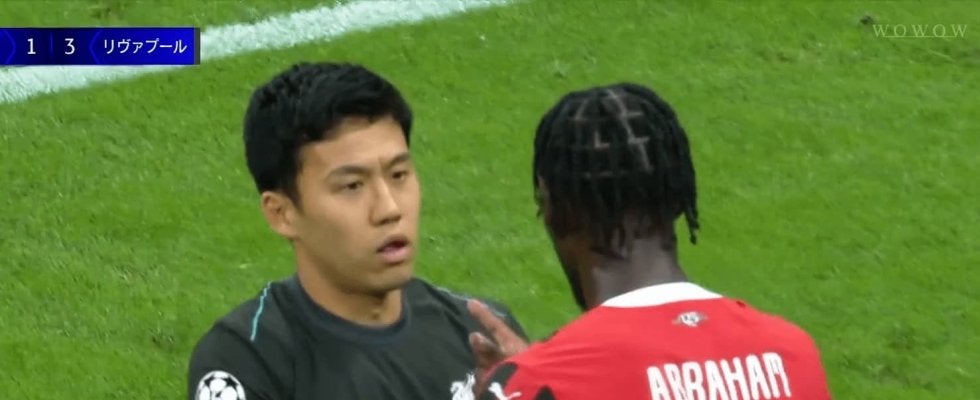 194cmの大男に激詰めされる事態となった。リヴァプールのMF遠藤航が、ミランのFWタミー・エイブラハムに対して激しいプレスを仕掛けてファウル判定に。直後、エイブラハムからブチギレられると、ファンからは「怖いだろうな」「喧嘩買わないねぇ」など様々な声が挙がった。