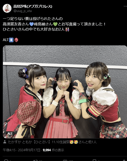 アプガプロレスの高見汐珠が、高須賀友香と峰島紬との写真を自身のSNSに投稿し、話題となった。【画像】東京女子プロレス 難…