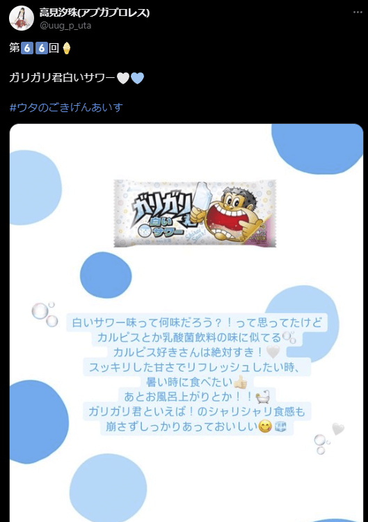 東京女子プロレス 高見汐珠、第66回「ウタのごきげんあいす」でガリガリ君白いサワーをレビュー! | 話題の投稿