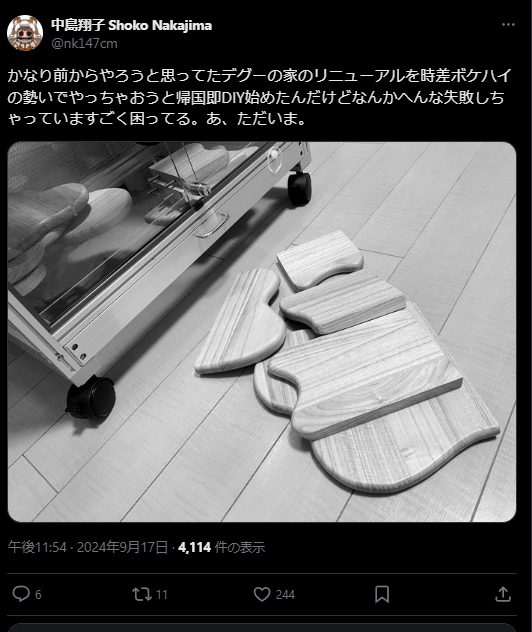 中島翔子が、帰国後すぐにペットのデグーの家をリニューアルするDIYに挑戦中だが、何やら失敗して困っている様子をSNSで報…