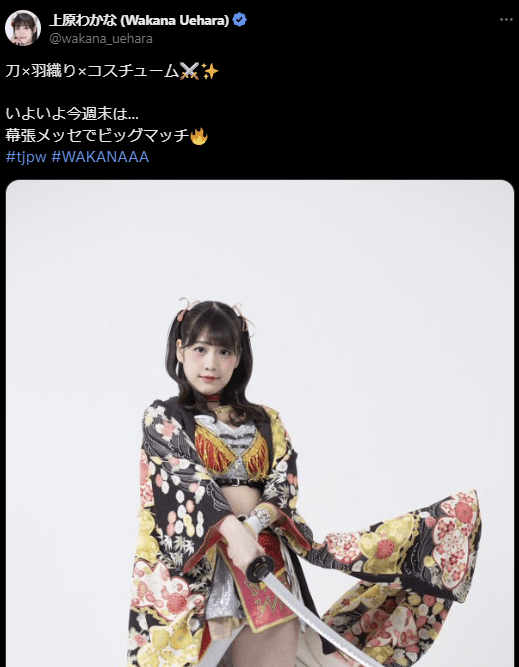 東京女子プロレス 上原わかな、刀×羽織り×コスチュームでファンを魅了!今週末の幕張メッセ大会に向け気合十分 | 話題の投稿