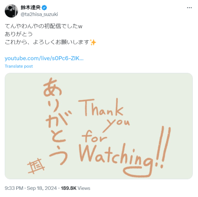 「てんやわんやの初配信でしたw」声優・鈴木達央が初のYouTube配信を実施! | 話題の投稿