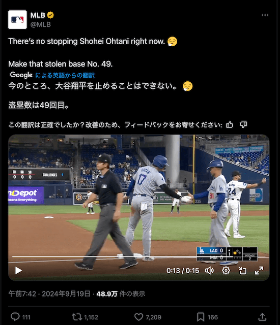 MLB公式が日本時間19日、Xを更新。【動画】「50-50」達成へ大躍進!大谷翔平、快速飛ばして48盗塁目「Theres…