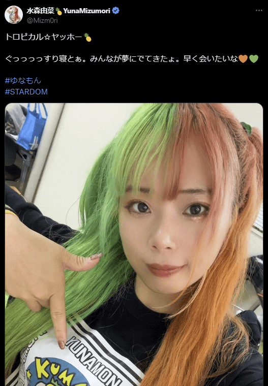 プロレスラーの水森由菜が19日、元気いっぱいのツイートを投稿した。【画像】STARDOM 向後桃、東北遠征前に準備万端!…