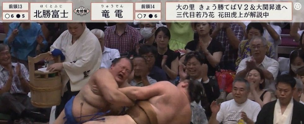 再出場となったもののプロとして土俵に立つからには、強い姿をファンに届けることが使命である北勝富士が、見事な執念を見せた。立ち合いで攻め込んだ竜電だったが、北勝富士はなんとか凌ぎ、そこから攻めに出た。竜電が土俵際に追い込まれる場面もあったが、苦しい体勢から上手投げを放ち形勢逆転を試みると、北勝富士が下手投げで返し、勝負有り。熱戦に館内は大きく沸いた。北勝富士は7勝5敗2休とし、千秋楽で前頭八枚目・翠富士(伊勢ヶ濱)に勝てば勝ち越しとなる。竜電は7勝7敗となった。