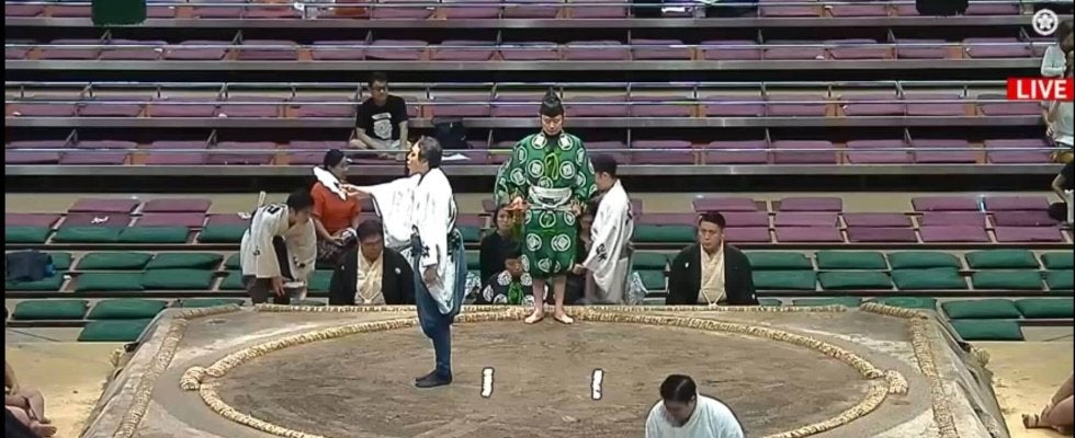 三段目九枚目・庄司(武蔵川)と三段目十一枚目・御雷山(錣山)の取組前の呼び出しとして登場した総一さん。「イケメン呼び出しとして人気を博した」と字幕で紹介されると視聴者がそのイケメンっぷりに注目した。