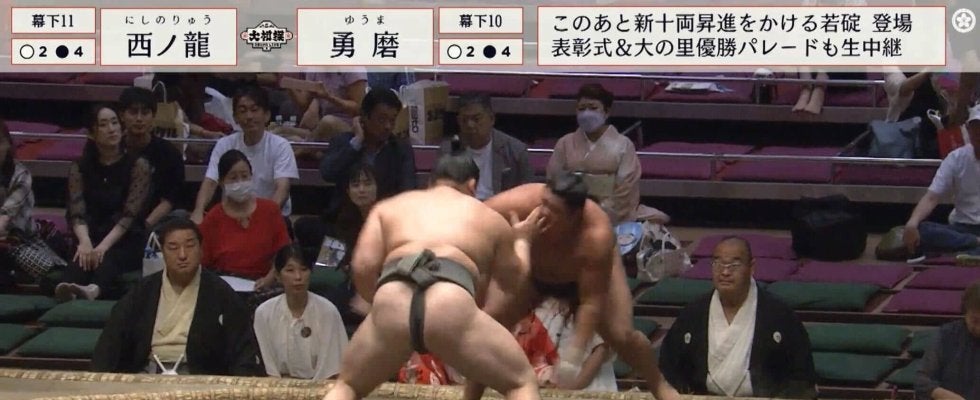 立ち合い、西ノ龍の前に出る相撲の圧力に後退した勇磨は、左足が土俵の外に出てしまった。一瞬の出来事だったため、西ノ龍は気づかずに突き押しで相手を沈めようとしたが、審判の元高見盛の東関親方が手を上げたため、ここで木村勘九郎が急いで力士の元に駆け寄り「勝負あり!勝負あった!勝負あり!」と静止した。この珍しい光景に館内は騒然となった。
