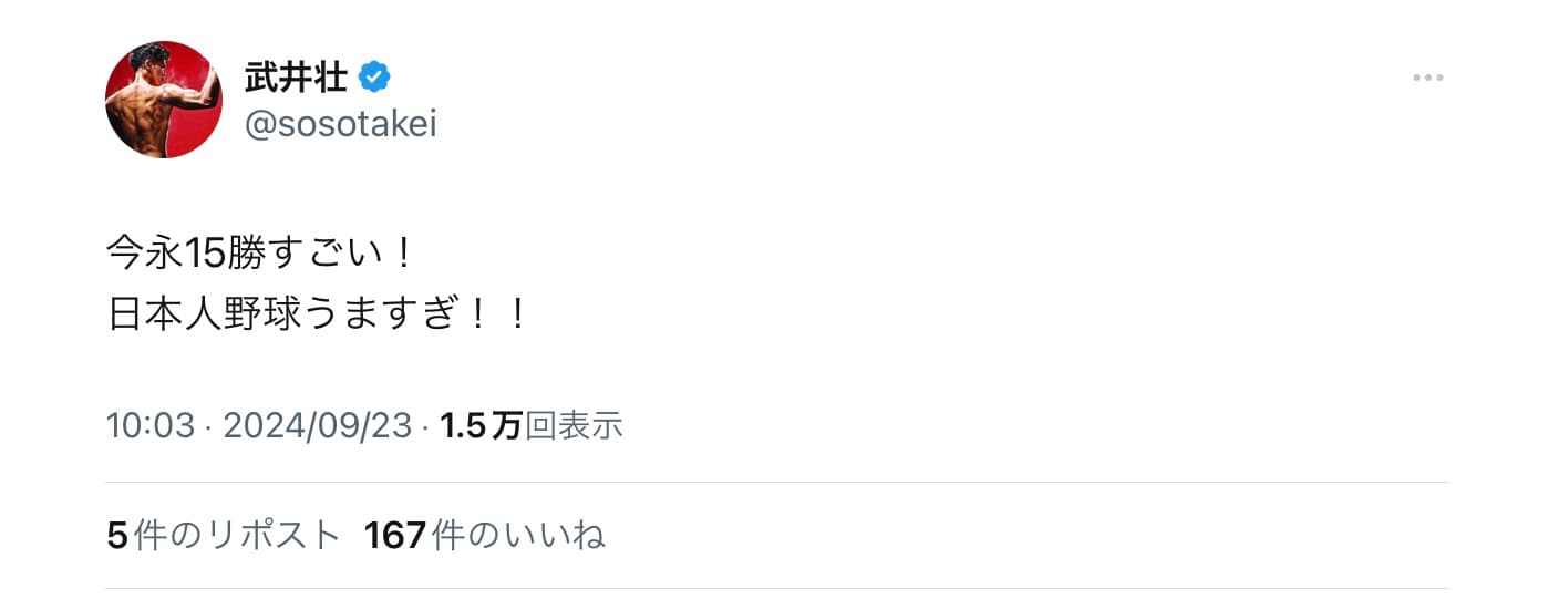 タレントの武井壮は23日、自身のXを更新した。【画像】今永昇太、日本人左腕初、ナ新人最多15勝目の快投!タレントの武井壮…