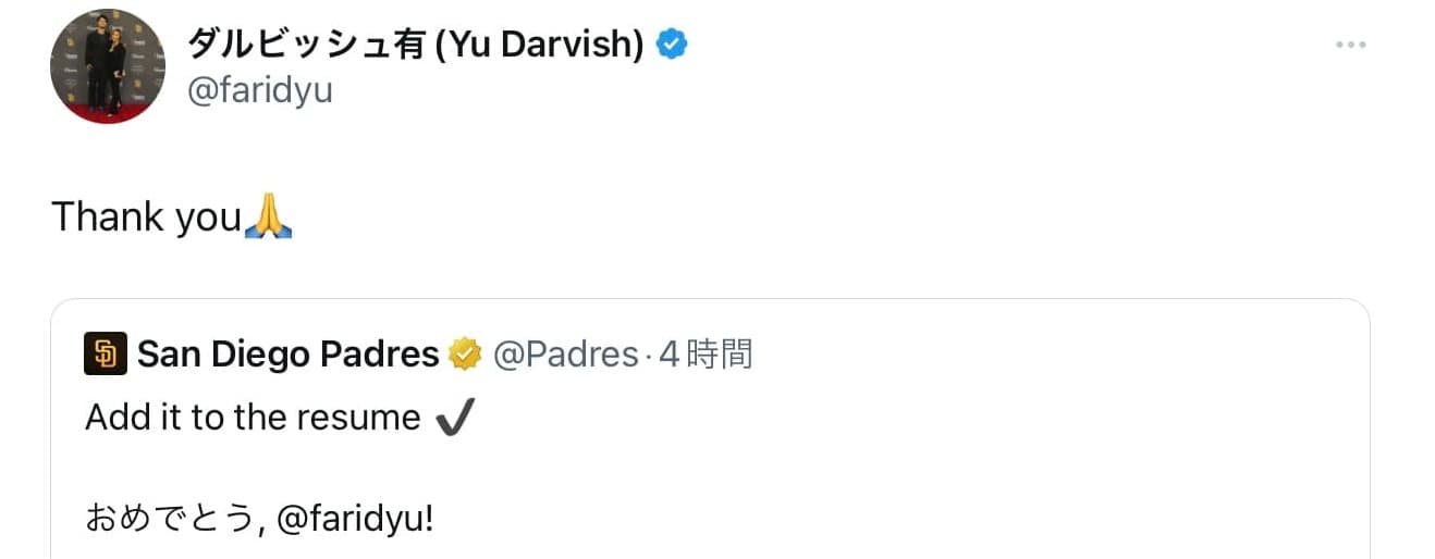ダルビッシュ「Thank you🙏」球団公式Xが祝福 | 話題の投稿