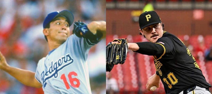 ドジャース時代の野茂英雄氏(左)とパイレーツのポール・スキーンズ【写真:Getty Images】