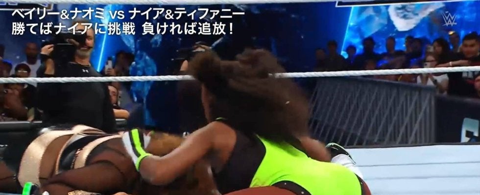 WWE「SMACKDOWN」で行われたナイア・ジャックス&ティファニー・ストラットンとベイリー&ナオミのタッグ戦での驚きの逆転ワザ。女子王者ナイアのパワーと重量に圧倒されっぱなしのナオミが放った信じられない一撃が試合の流れを変えた。
