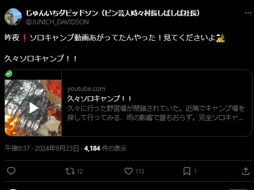 キャンプ芸人 じゅんいちダビッドソン、久々のソロキャンプ動画を公開! | 話題の投稿