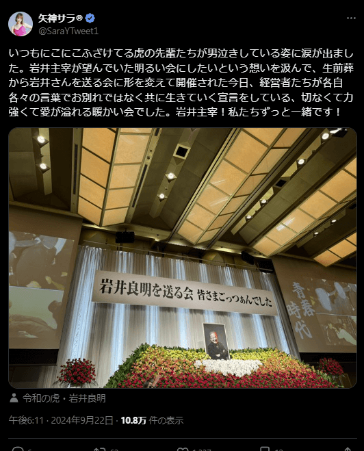 矢神サラがX(旧Twitter)にて、令和の虎・岩井良明氏を送る会に参加した感動の思いを綴った。【画像】グラビアアイドル…