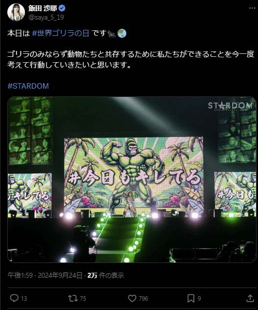 9月24日は「世界ゴリラの日」である。STARDOMの飯田沙耶は、自身のX(旧Twitter)でこの日に対する想いを発信…