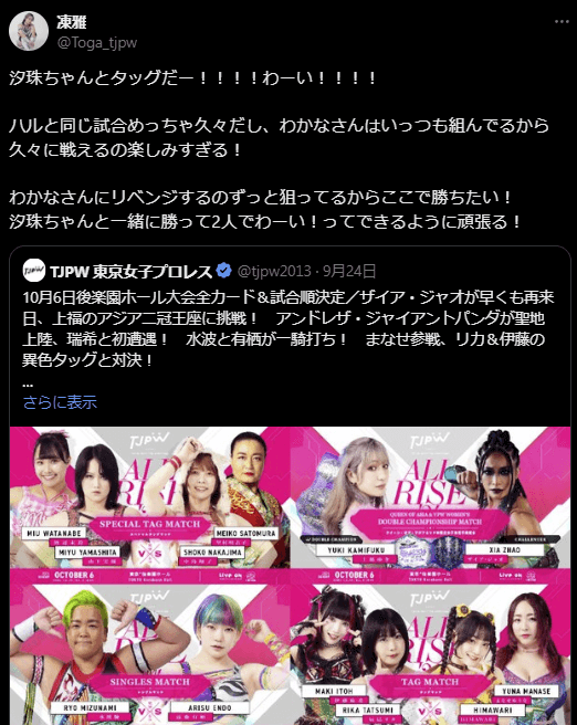 東京女子プロレスの凍雅が、X(旧Twitter)で10月6日の後楽園ホール大会に向けた意気込みを投稿。【画像】東京女子プ…