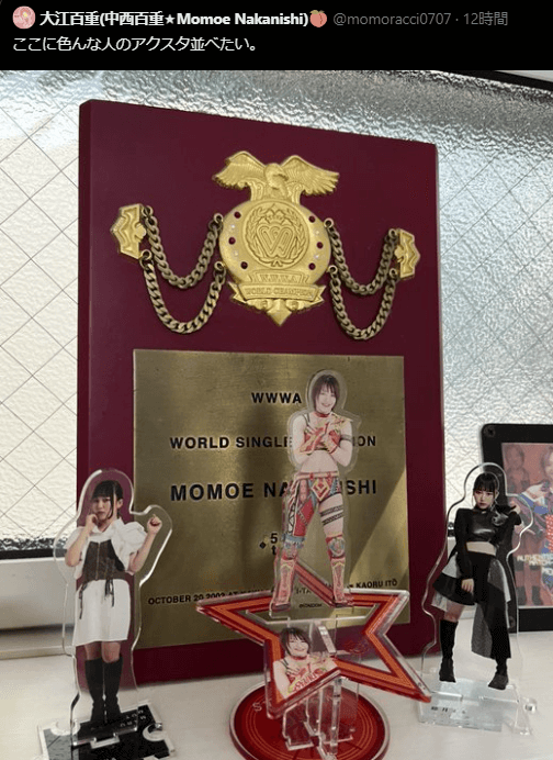 スターダムの朱里が自身のX(旧Twitter)で、大江百重(中西百重)がアクスタを並べたいというコメントに対し、「あら!…