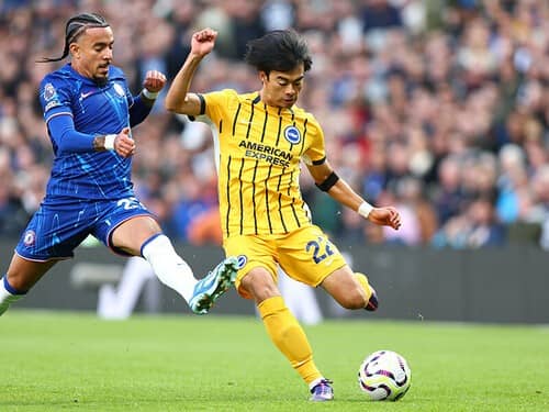 いつものように4-3-3の左ウイングで先発した三笘薫が、開始40秒、まず魅せた。CBルイス・ダンク(元イングランド代表)のフィードをハーフウェイライン上のタッチライン際で受けると、右足の細かなボール操作で対峙する相手右SBマロ・ギュスト(フランス代表)をきれいに抜き去り、ライン際を疾走。スタンフォードブリッジのバックスタンドを埋めたチェルシーファンの目の前で、ドリブル&フェイントを挨拶代わりと言わんばかりに、さっそく披露した。