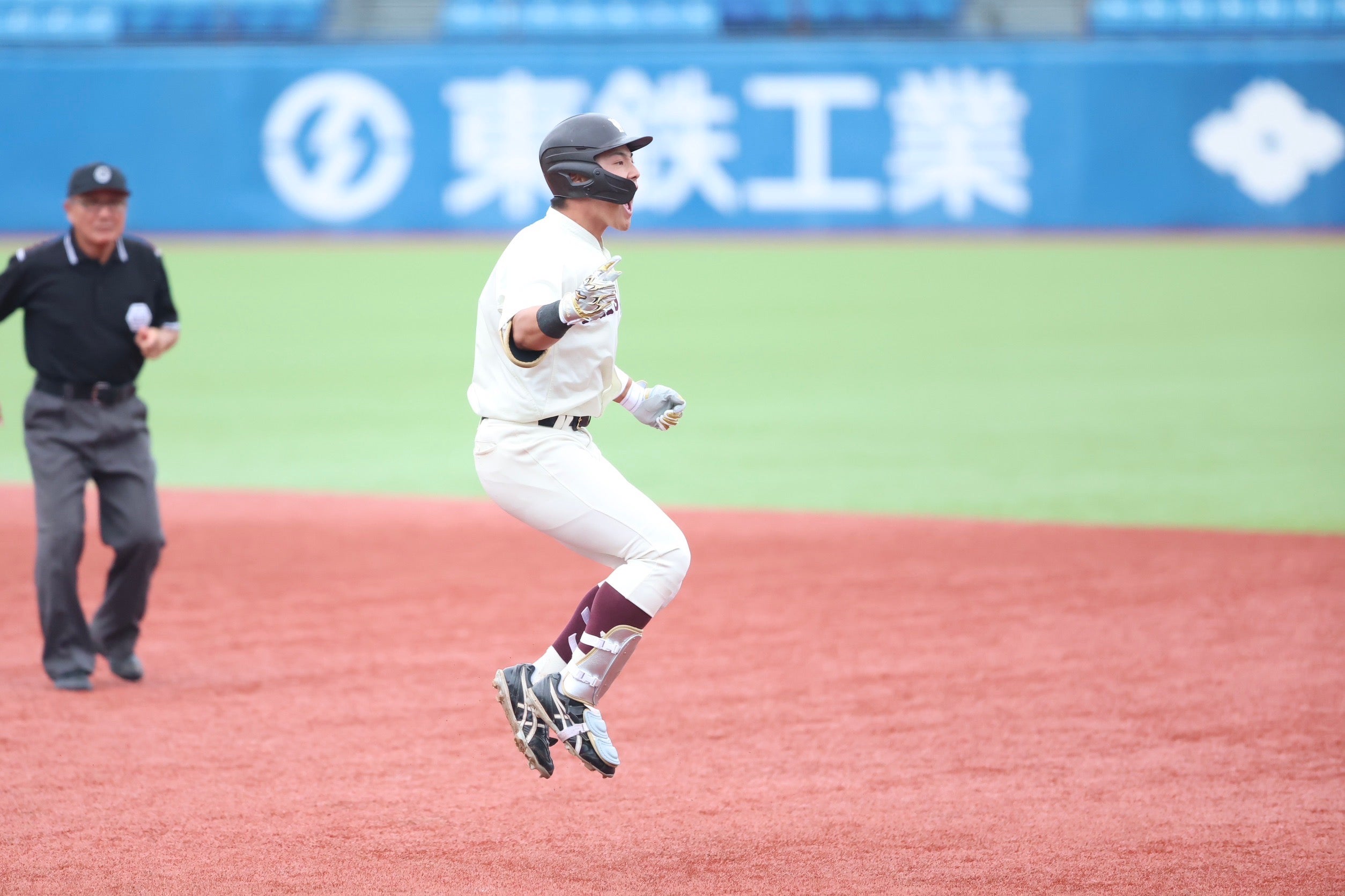 2-4とリードされて迎えた7回。吉納は1死一、二塁の好機で左打席に立った。マウンドには、こちらもドラフト候補の左腕・吉鶴翔瑛投手(4年)がいた。カウント2-2から、147キロを計測した外角の速球を“逆方向”の左翼へ打ち返す。飛球がフェンスを越え、吉納は一、二塁間で歓喜の雄叫びを上げながら、ガッツポーズを繰り出した。