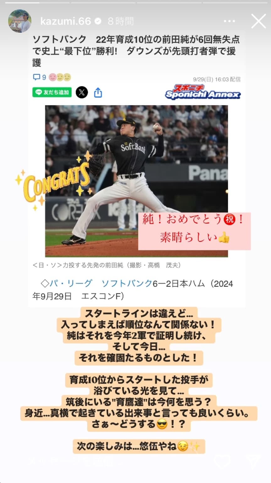 ソフトバンク斉藤和巳「純!おめでとう㊗️!」育成10位前田純初勝利 | 話題の投稿