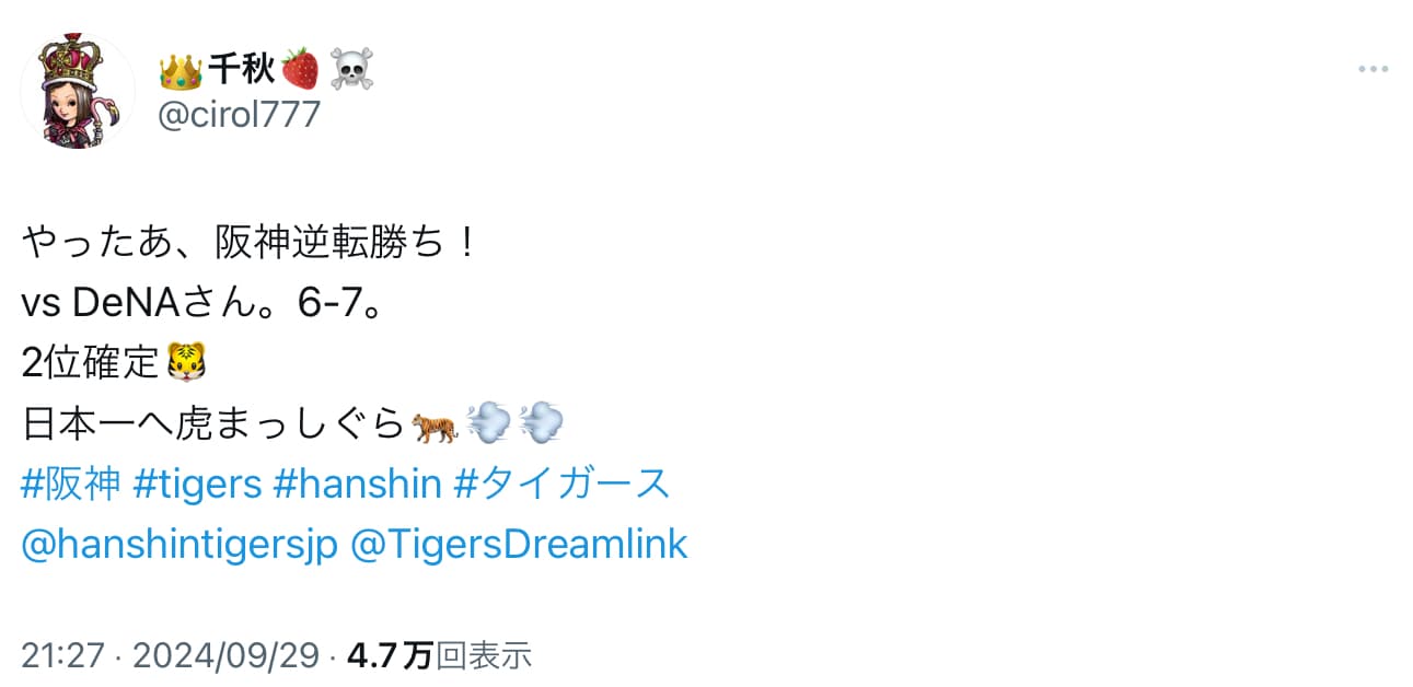 千秋「2位確定🐯」前日に優勝逃すもCS本拠地決める。 | 話題の投稿