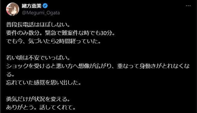 緒方恵美が勇気ある電話に感謝「勇気だけが状況を変える。 ありがとう。話してくれて。」 | 話題の投稿