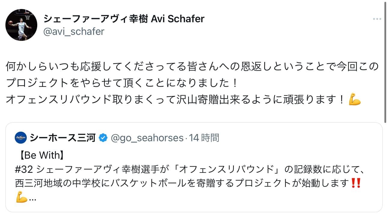 Bリーグ三河・シェーファーアヴィ幸樹「いつも応援してくださってる皆さんへの恩返し」成績に応じボール寄贈🏀 | 話題の投稿