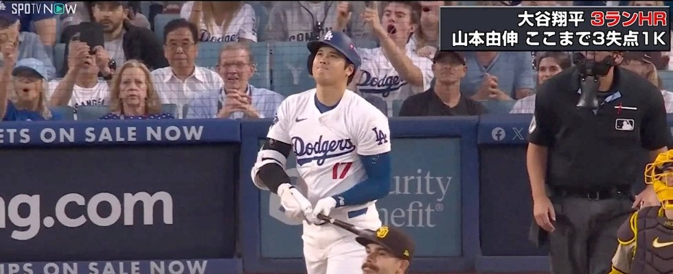 ドジャースが0-3と3点ビハインドの2回裏、2死一、二塁の場面で大谷がインハイのストレートを捉え、弾丸ライナーの同点3ランホームランを放った。MLB公式データサイト『Baseball savant』によると打球速度111.8マイル(約180キロ)、打球角度25度、飛距離372フィート(約113メートル)の一発に大谷は、いつも以上に激しいバットフリップならぬバット投げ捨てを見せ感情を剥き出しにした。