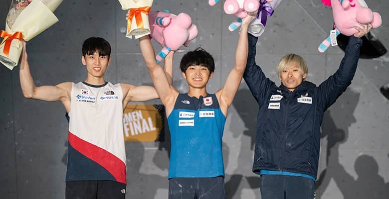 直前に終了した女子決勝と同じく、男子決勝は壁の形状的に下部から傾斜が強いルートが取られた。5番手のイは地元の声援を背に初めて終盤に進入。45+までスコアを伸ばした。後続の小俣でさえイに10手届かない高度35止まりだった中、最後に登る安楽は勢いよく登っていき、難なく終盤へ。最後はイと同じく46手目の左手がかかり切らずに落下し、首をかしげるも、準決勝順位へのカウントバックで自身の優勝を知ると両手を挙げて喜んだ。