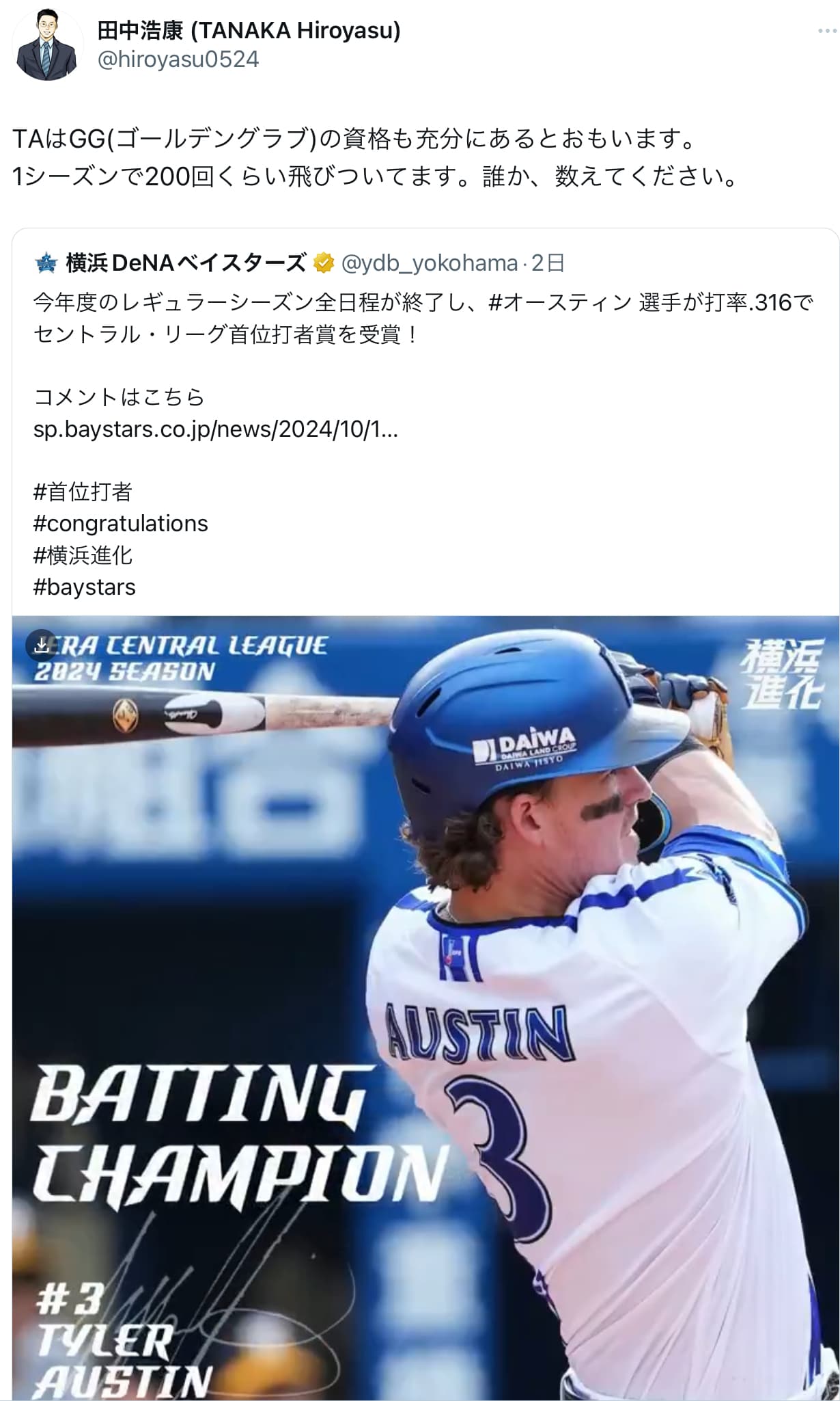 DeNA田中浩康コーチ「TAはゴールデングラブの資格も充分にあるとおもいます。」首位打者オースティンの守備に言及 | 話題の投稿