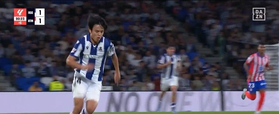 注目の“1人カウンター”は1-1で迎えた後半アディショナルタイムの90+1分。アトレティコ・マドリーの攻撃をストップさせたレアル・ソシエダは、自陣低い位置から右サイドでフリーとなっていた久保にボールを預けた。