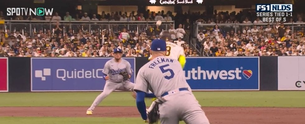 ベッツが初回にソロホームランで1-0とドジャースが1点リードで迎えた2回裏、パドレスの4番・マチャドがヒットで出塁した。続くメリルが4球目を打ち返したが、この打球をファーストのフリーマンがうまく掴んだ。
