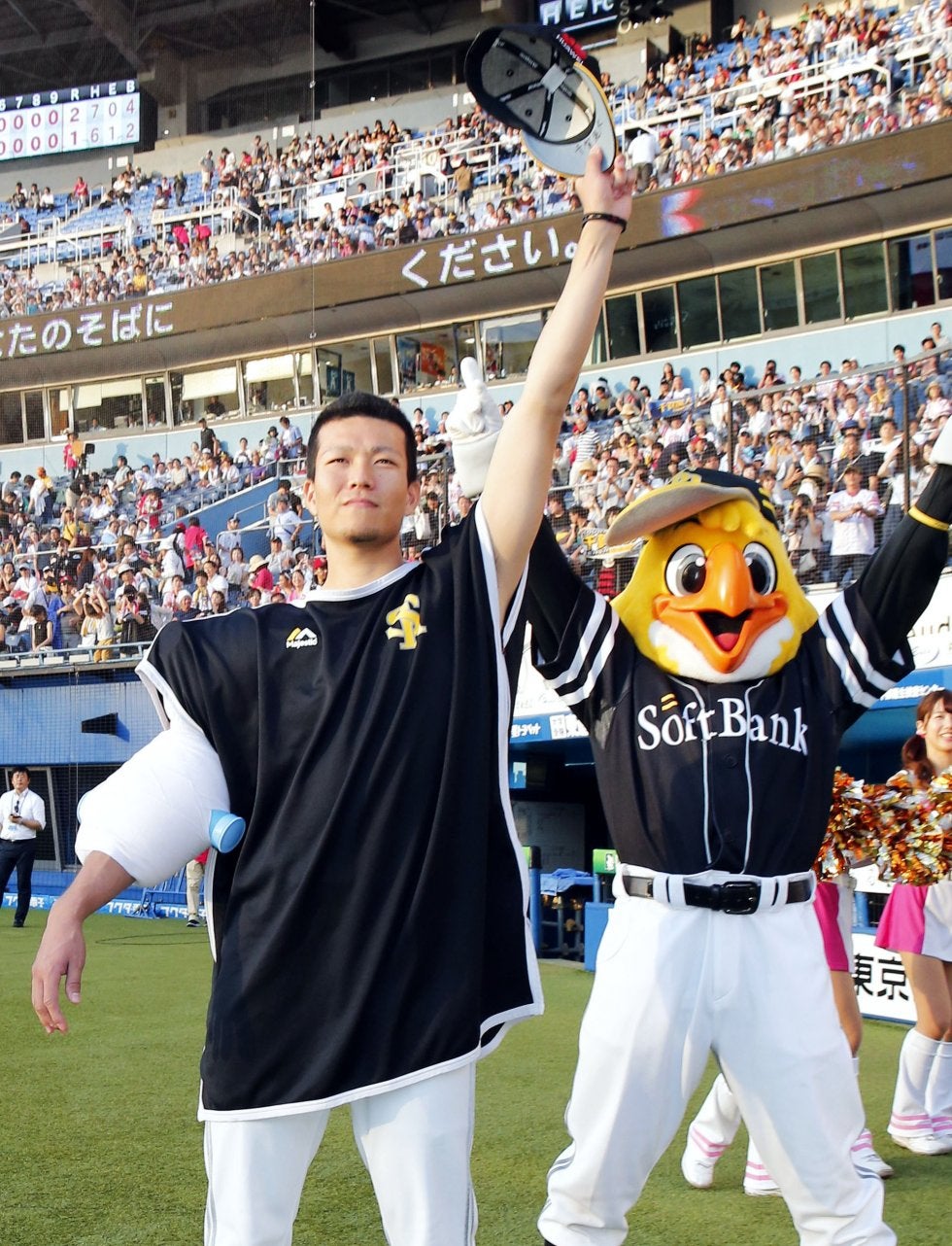 ロッテに勝利しファンの声援に応えるソフトバンク・千賀=ZOZOマリン【写真提供:共同通信社】