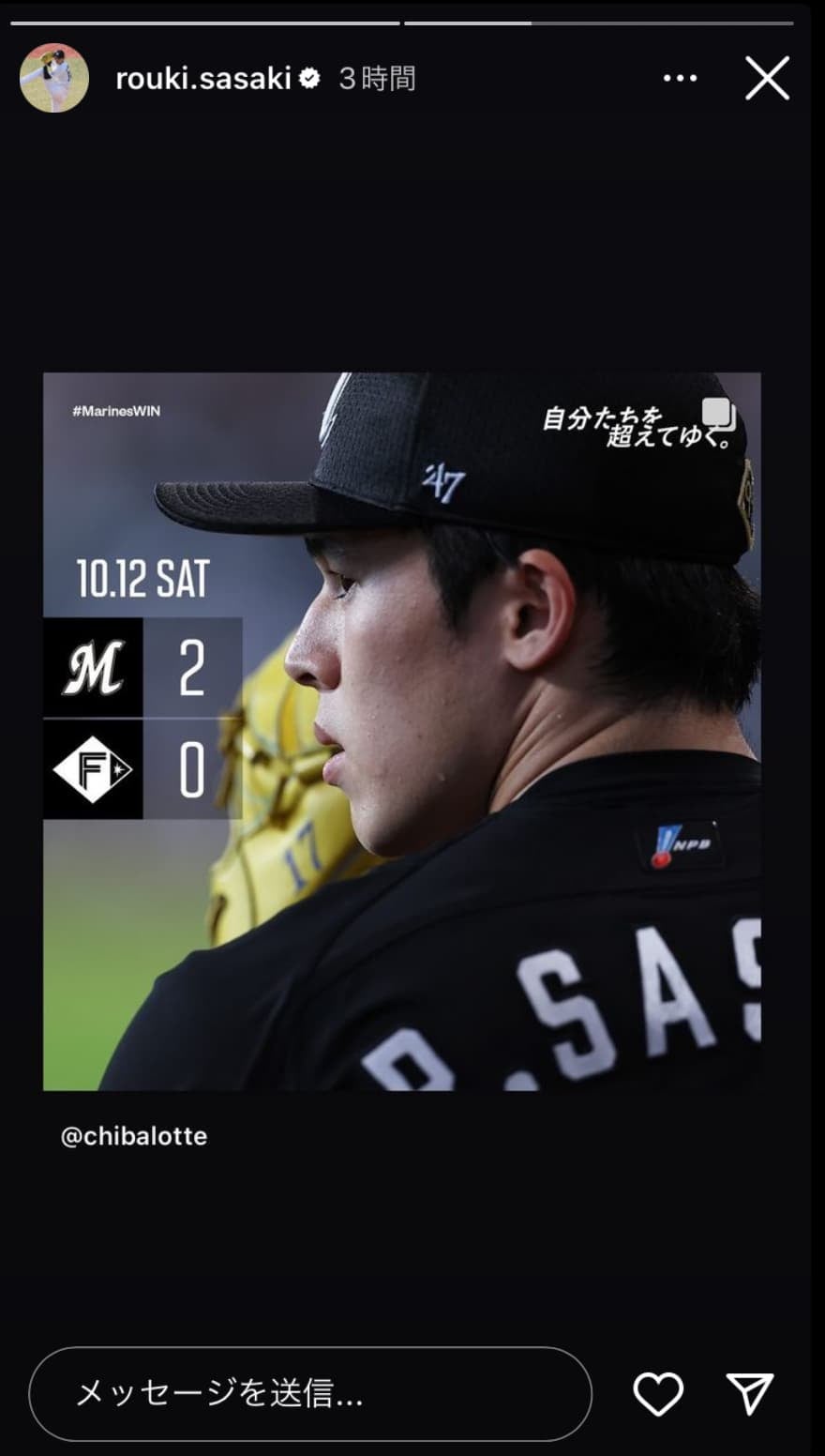 ロッテの佐々木朗希が12日、自身のインスタグラムを更新。【画像】ロッテ佐々木朗希 キャリアハイの10勝目⭐️球団公式イン…
