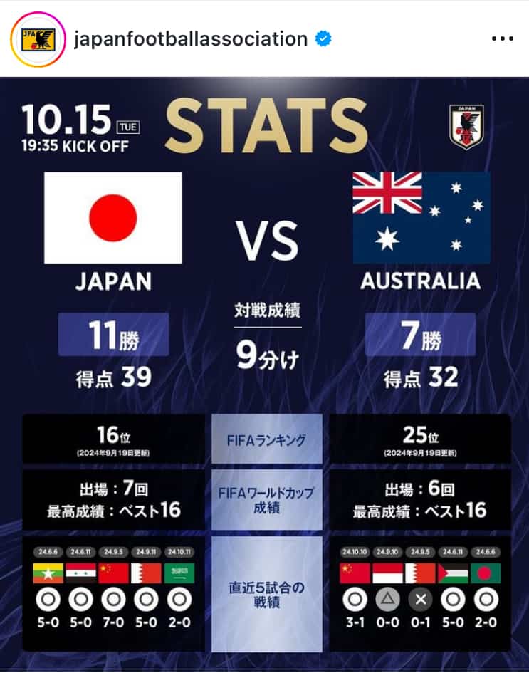 ワールドカップ予選のオーストラリア戦を間近に控え、日本代表公式インスタグラムにて過去の対戦成績に触れた投稿が公開された。…