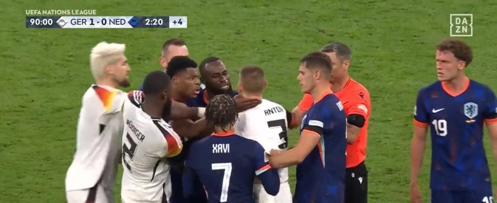 ボールではなく体を狙った悪質なスライディングに対して、オランダ代表の選手たちはすぐさまアントンを取り囲んで猛抗議。チャビ・シモンズはアントンの背中側のユニフォームを掴んで突き飛ばすなど、大荒れの展開となった。そこへアントニオ・リュディガーが駆けつけ、アントンを引き離す。しかし怒りが収まらないオランダ代表の選手たちは、激しい剣幕でアントンに詰め寄った。